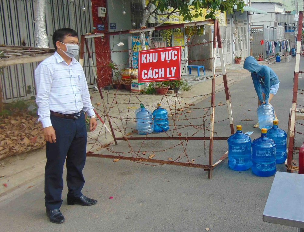 Lãnh đạo UBND phường Hiệp Thành, quận 12, TP.HCM giám sát điểm phong tỏa trên địa bàn. Ảnh: TRẦN NGỌC