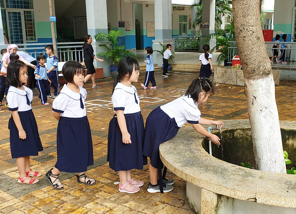 Vòi nước rửa tay kết hợp tưới cây giúp tiết kiệm nước tại Trường Tiểu học Lê Văn Việt (quận 9). Ảnh: CN