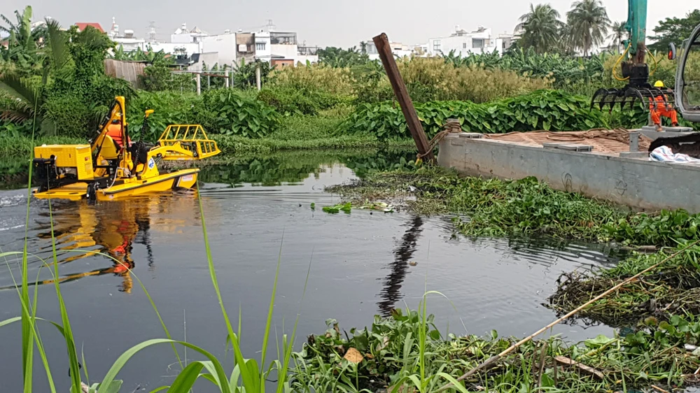 Các công nhân đang vớt rác trên sông Vàm Thuật - Bến Cát, đoạn qua quận 12 bằng việc sử dụng thiết bị hiện đại với công nghệ mới. Ảnh: NGUYỄN CHÂU