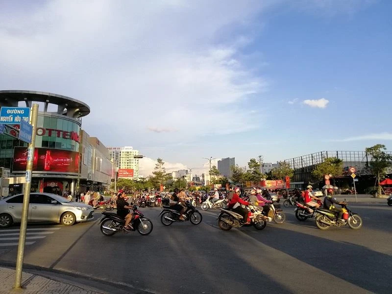 Đường Nguyễn Hữu Thọ hơi đông đúc nhưng các phương tiện cũng chỉ chờ hai nhịp đèn chứ không xảy ra hiện tượng kẹt xe.