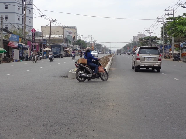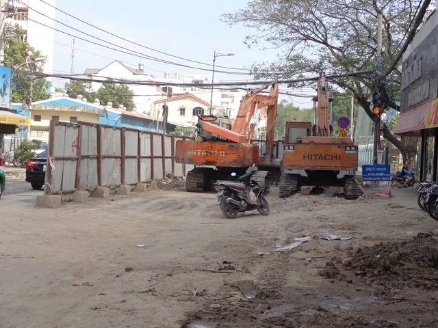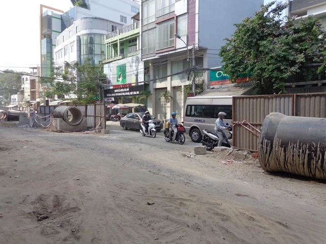 Trên đường Bạch Đằng, đoạn gần giáp đường Hồng Hà, cống đã được đặt, nền hạ mới đã được làm nhưng phần nền thượng và lớp bê tông nhựa nóng chưa được trải nên giữa mặt đường hiện hữu phía ngoài hàng rào và đường phía trong vênh nhau cả 40-50 phân. “Hai phần đường vênh nhau, tạo hố như thế nếu tháo hàng rào đi, chỉ chăng dây thì nguy hiểm cho người dân đi lại lắm! Nên thôi các bác cho em nó (hàng rào) được tồn tại!” - vị chỉ huy công trường nói.