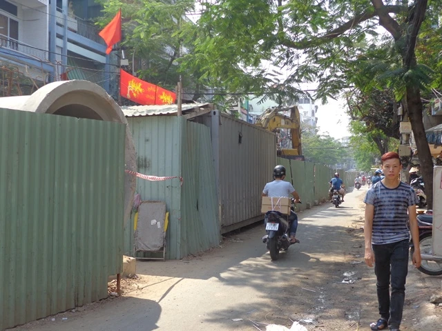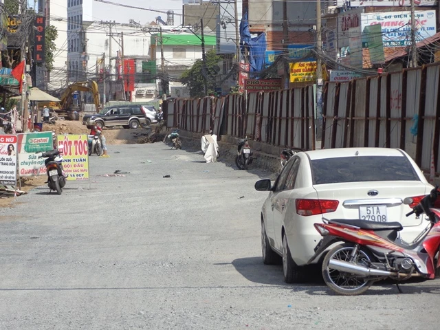 Đường Hồng Hà, quận Tân Bình, đoạn gần giáp đường Trường Sơn, vách tôn nằm ngay giữa tim chia đường thành hai phần: bên trong là công trường ngổn ngang, bên ngoài là đường đi lổn nhổn đá và bụi mù.