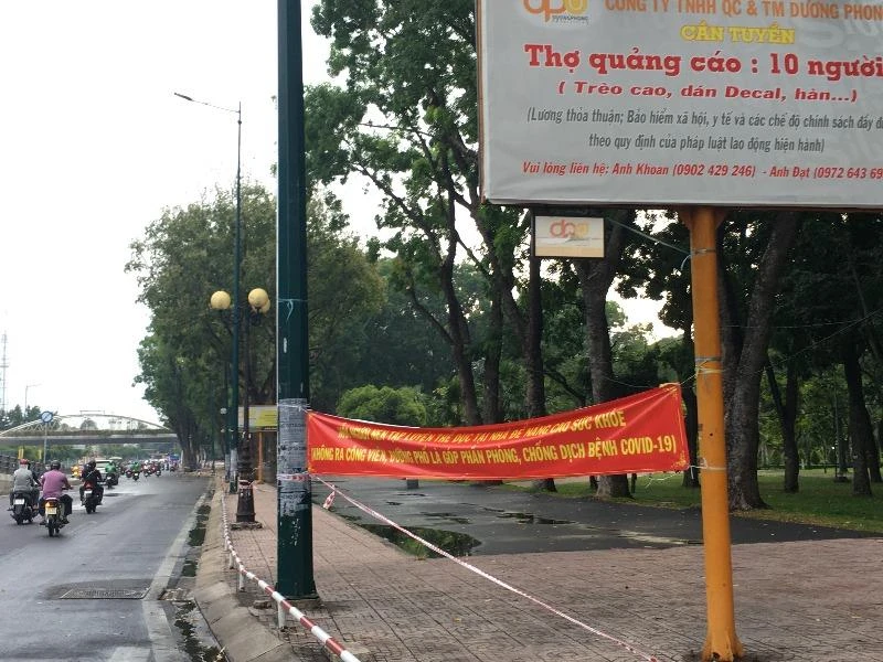 Dù có băng rôn về việc phòng, chống dịch COVID-19 nhưng người dân vẫn đi dạo, tập thể dục và ăn uống trên đường Trường Sa (quận Phú Nhuận). Ảnh: THY NHUNG