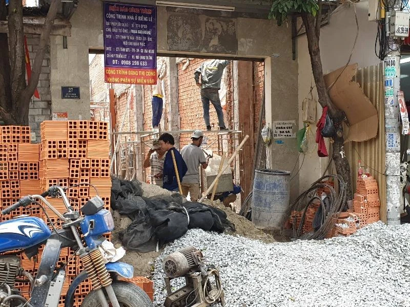 Công nhân xây dựng không đeo khẩu trang khi làm việc. Ảnh: NGUYỄN CHÂU