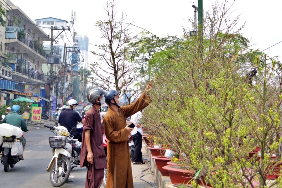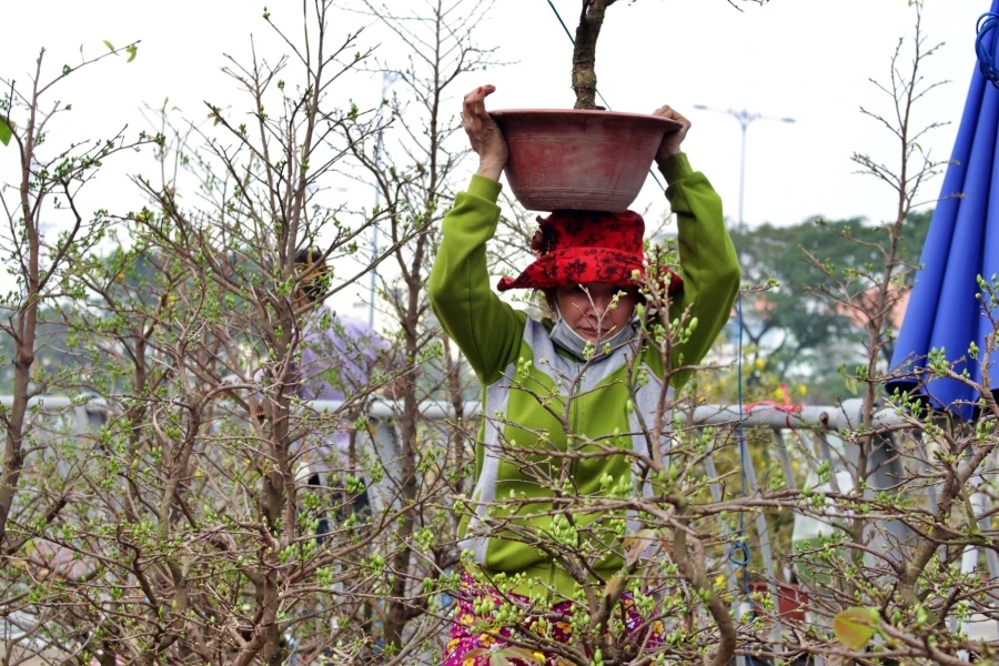 Gác nỗi lo buôn bán ế ẩm do dịch COVID-19, các tiểu thương hòa vào không khí nhộn nhịp, tất tả sắp xếp hoa trái, cây kiểng sao cho đẹp mắt.