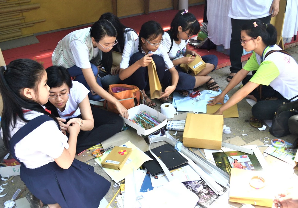 Các em học sinh thích thú tham gia làm túi giấy tại ngày hội tái chế