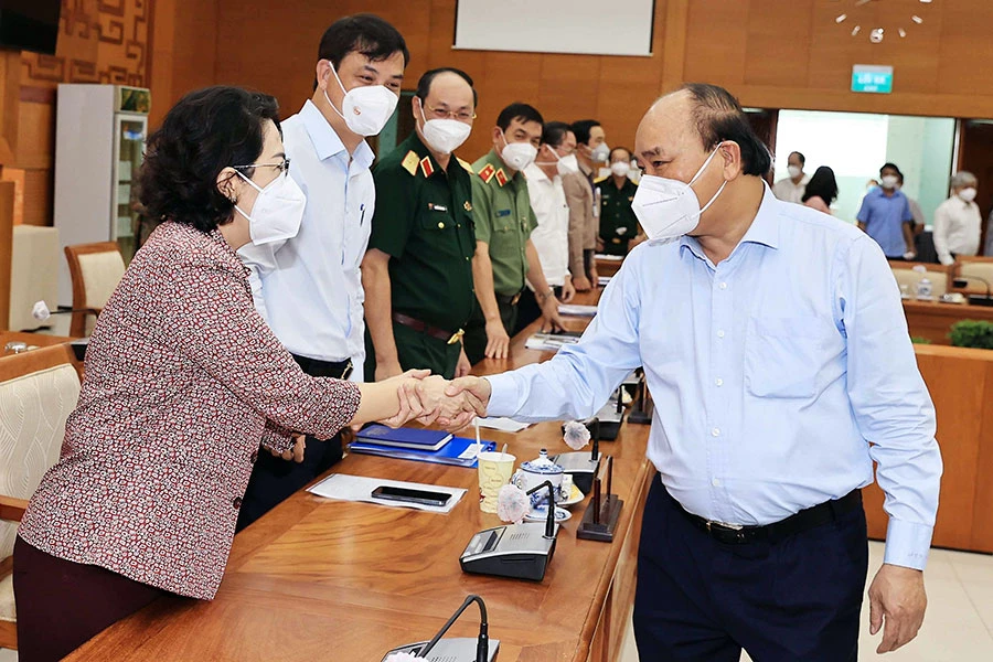 Chủ tịch nước Nguyễn Xuân Phúc tại buổi làm việc với lãnh đạo TP.HCM về công tác phòng chống dịch COVID-19 trên địa bàn. Ảnh: TTXVN