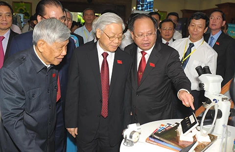 Tổng bí thư cùng các lãnh đạo Đảng, nhà nước tham quan triển lãm thành tựu khoa học công nghệ của TP.HCM. Ảnh: HTD