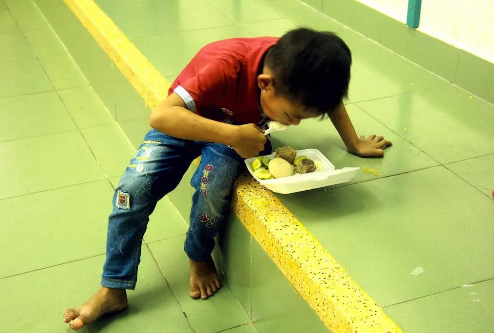 Một em bé sau khi nhận cơm liền vội ăn ngay trên bục giảng lớn học.