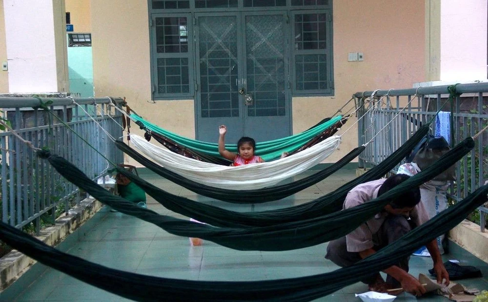 Ngoài việc trải bạt nằm bên trong các lớp học, nhiều người được phát võng để nằm phía bên ngoài các hành lang khuất gió của trường học.