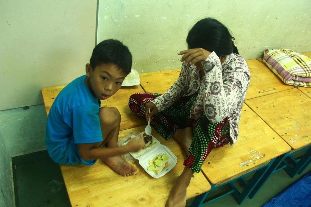 Hai mẹ con chị Hoa tranh thủ ăn cơm trước khi bão vào.