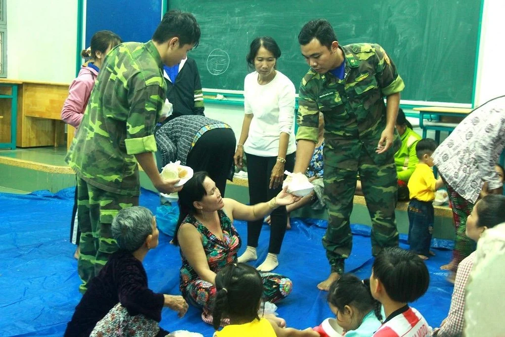 Các chiến sĩ bộ đội phát cơm tối và nước uống cho người dân.