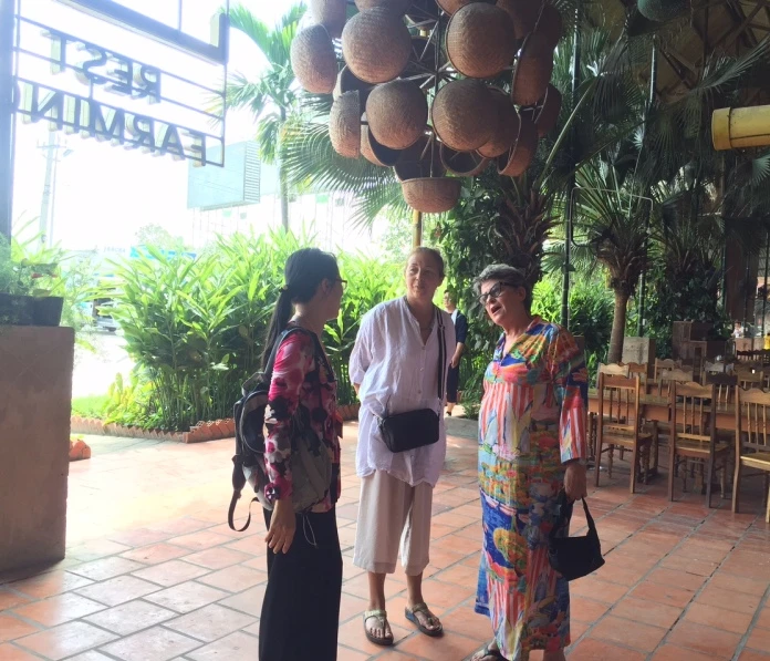 Du khách đang nghe giới thiệu về du lịch miền Tây tại một điểm dừng chân (Tiền Giang).