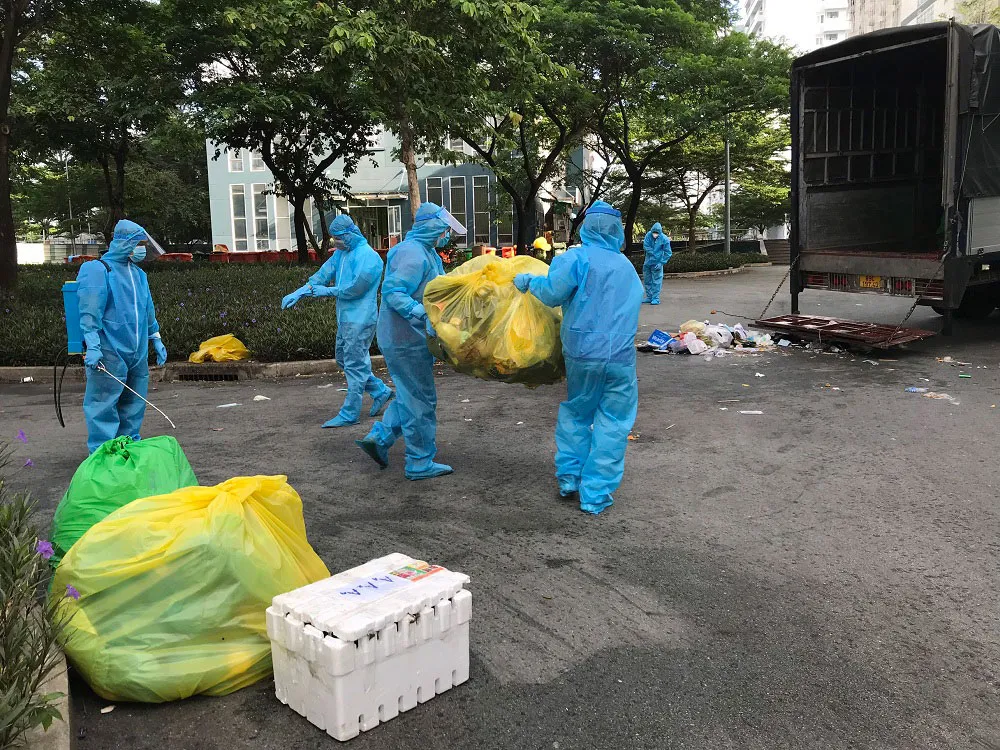 Nhân viên Công ty Môi trường đô thị TP.HCM thu gom rác thải ở khu cách ly. Ảnh: T.KHOA