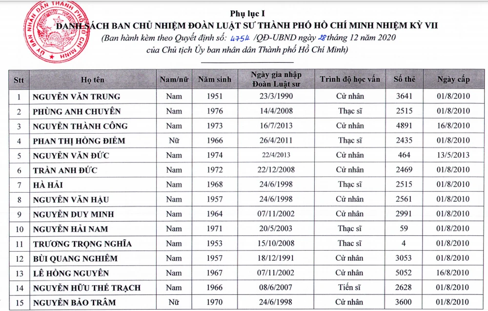 Danh sách ban chủ nhiệm Đoàn luật sư TP.HCM nhiệm ký VII