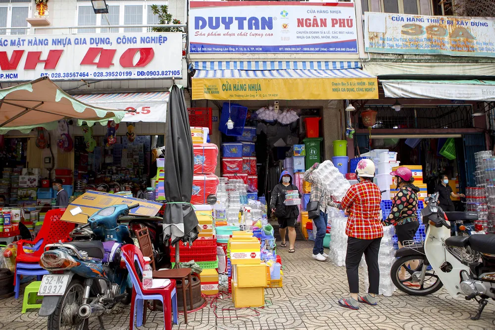 Một vài cửa hàng kinh doanh đồ nhựa tại quận 5 bắt đầu đón khách, nhiều người dân đang tranh thủ mua sắm đồ đạc để tiến hành mở bán lại các tiệm thức ăn, đồ uống.