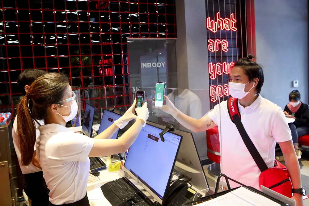 Ghi nhận tại phòng tập gym trên đường Lê Lợi, quận 1, TP.HCM, khách hàng đến phòng tập xuất trình mã chứng nhận tiêm hai mũi vaccine.