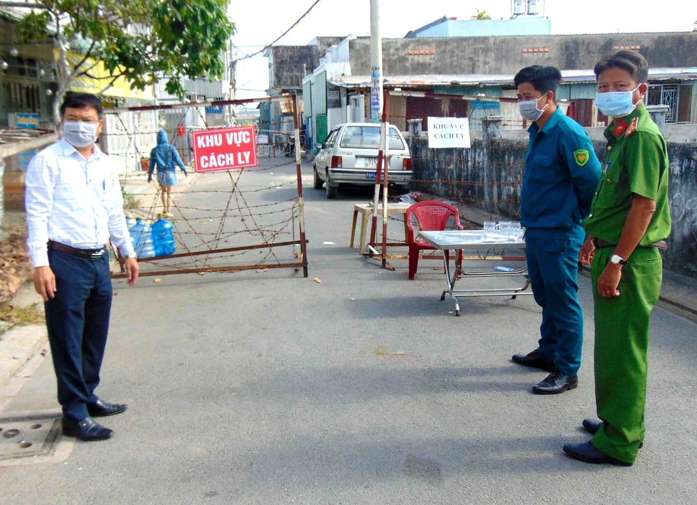Cơ quan chức năng đang giám sát khu vực bị phong tỏa trên địa bàn phường Hiệp Thành, quận 12. Ảnh: TRẦN NGỌC