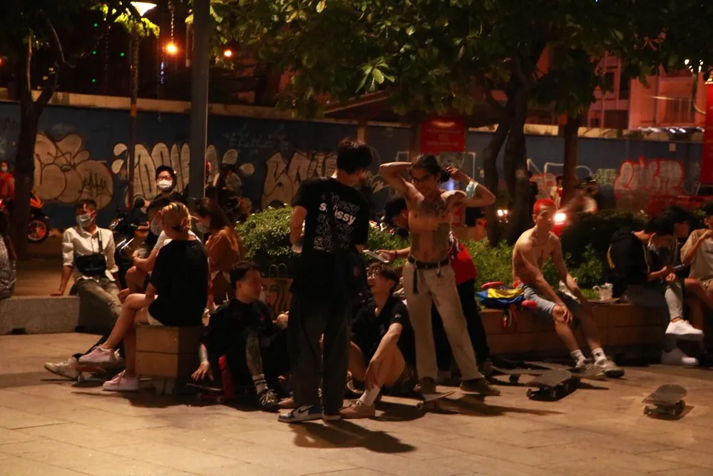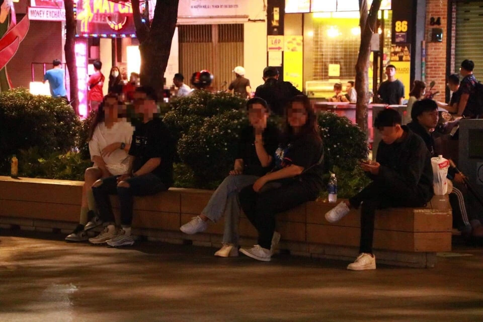 Nhóm thanh niên tụ tập, không đeo khẩu trang tại phố đi bộ Nguyễn Huệ. Ảnh: CM