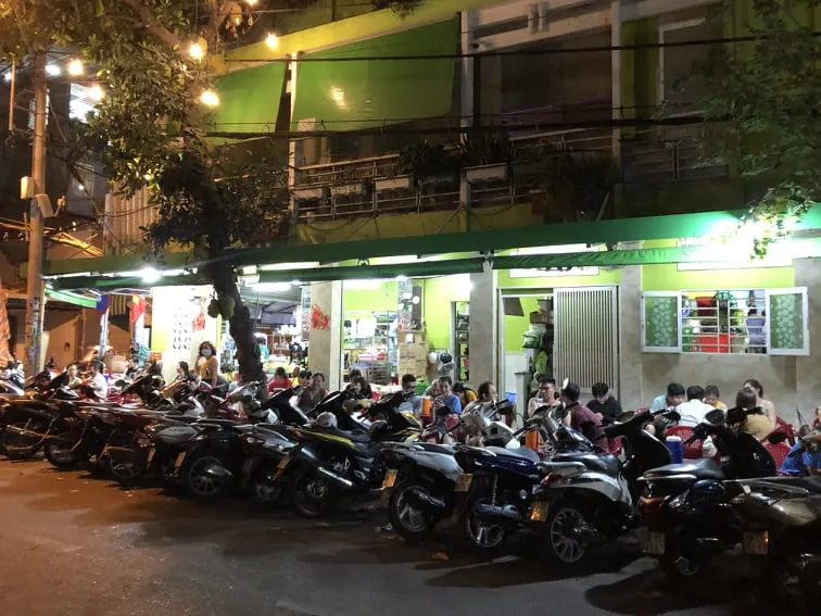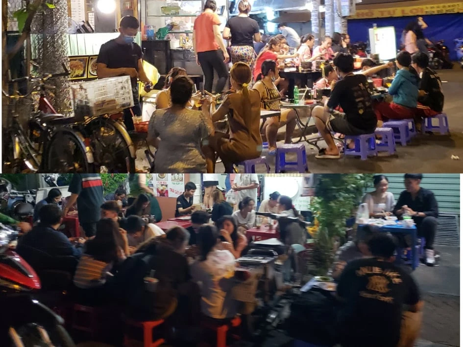 Cũng đêm 12-5, tại một quán ăn vặt ngay giao lộ Huỳnh Mẫn Đạt – Phạm Viết Chánh (phường 19 quận Bình Thạnh), khách đến quán rất đông, trên vỉa hè và dưới lòng đường sát quán xe máy được xếp kín.