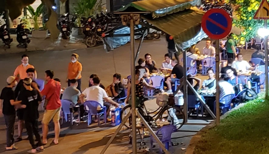 Khách nhậu ngồi ngoài đường, nhiều nhân viên quán không đeo khẩu trang khi phục vụ khách tại quận Bình Thạnh. Ảnh: CM