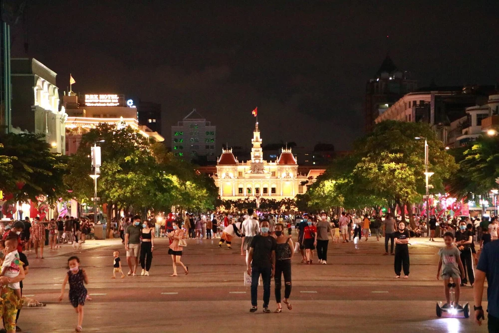 Phố đi bộ Nguyễn Huệ vẫn đông du khách đến tham quan, nhiều người không giữ khoảng cách, không đeo khẩu trang. Ảnh: CM