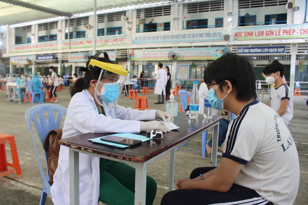 Tại điểm tiêm trường THCS Lam Sơn (phường 2, quận Bình Thạnh), trong buổi sáng trường tổ chức tiêm cho các học sinh thuộc khối 7, 8, 9. Vào buổi chiều, các học sinh từ đủ 12 tuổi còn lại sẽ được tiêm.