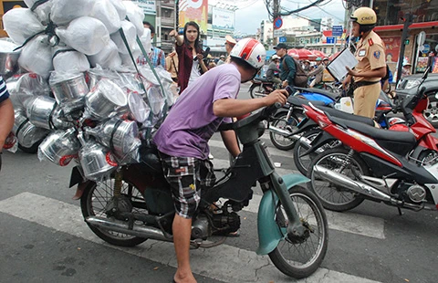 Khác với anh Hoa, đa phần trường hợp lái xe chở hàng thuê tại khu vực quận 5 đều là xe của chủ cơ sở và dù biết không đảm bảo an toàn nhưng chủ cơ sở vẫn giao cho người làm chở hàng đi giao cho khách. Như trường hợp anh Nguyễn Chí Hiếu (ngụ quận 6) bị CSGT tạm giữ xe khi vừa đi giao trà sữa cho khách về trên đường Châu Văn Liêm. Xe của anh Hiếu cũng “đủ thứ không” như không còi, không đèn soi biển số, không đèn chiếu sáng, không đèn tín hiệu, không giấy phép lái xe, không giấy đăng ký xe, không bảo hiểm...