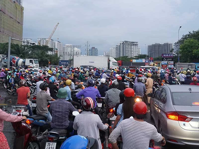 Ghi nhận của PV tuần qua tại khu Nam TP, khoảng 17 giờ 30 mỗi ngày, ô tô, xe máy từ đường Nguyễn Hữu Thọ qua cầu Kênh Tẻ (nối quận 4 và 7) rời trung tâm TP về quận 7 rất đông, gây ùn tắc, các phương tiện phải nhích từng chút một.