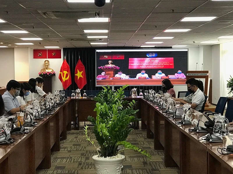 Cuộc họp trực tuyến tại điểm cầu Trung tâm Báo chí TP.HCM vào chiều 12-3. Ảnh: THANH TUYỀN