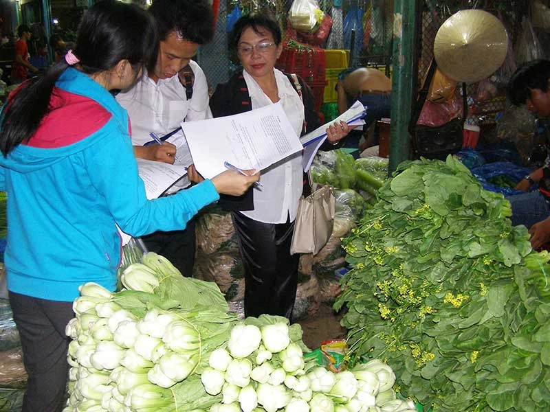 Đoàn kiểm tra đang xem xét nguồn gốc rau tại chợ đầu mối nông sản Thủ Đức, TP.HCM. Ảnh: TRẦN NGỌC