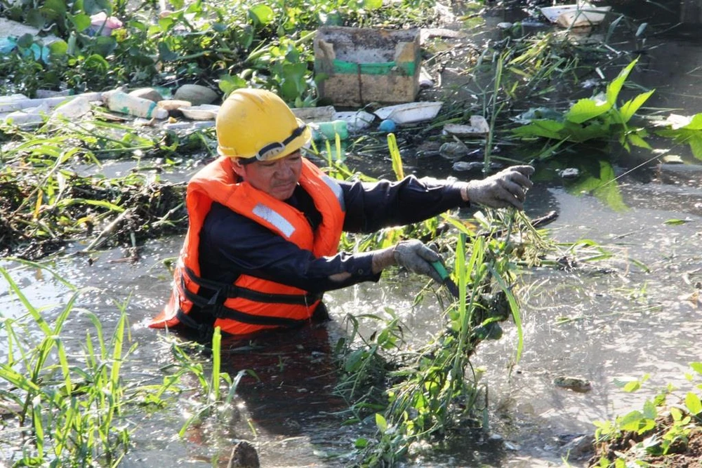 Dòng kênh Rạch Lăng (Bình Thạnh) ngập ngụa rác và lục bình đang được các công nhân nạo vét, khơi thông dòng chảy (Ảnh: PHI NGUYỄN).