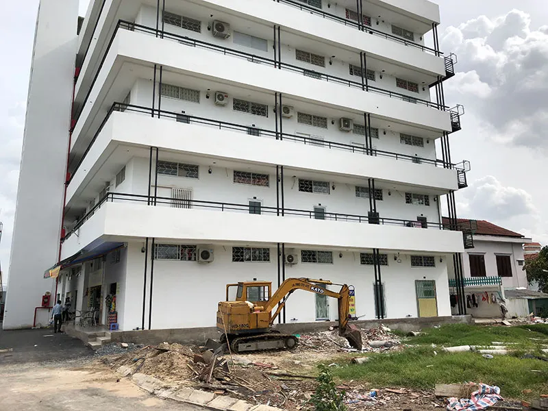 Trong quá trình xây dựng, chủ đầu tư đã tự ngăn chia bên trong công trình. Tầng trệt và tầng lửng mỗi tầng 13 phòng; tầng 2, 3, 4 mỗi tầng có 17 phòng. Công trình tổng cộng có 77 phòng, mỗi phòng có nhà vệ sinh, kệ bằng tấm đan xi măng, không có bếp. Công trình thi công chưa hoàn thiện.