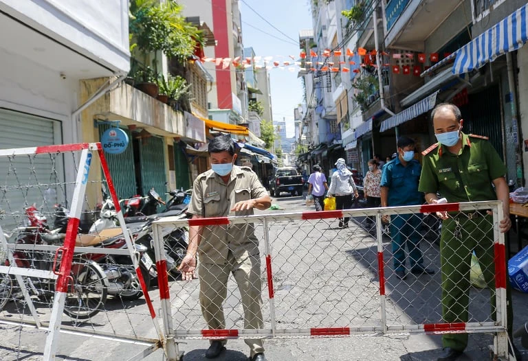 Lực lượng chức năng làm nhiệm vụ tại một khu phong tỏa ở quận 3. Ảnh: NGUYỆT NHI