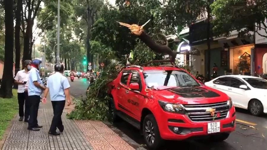 Một vụ mưa giông khiến cây gãy đổ, đè lên phương tiện giao thông
