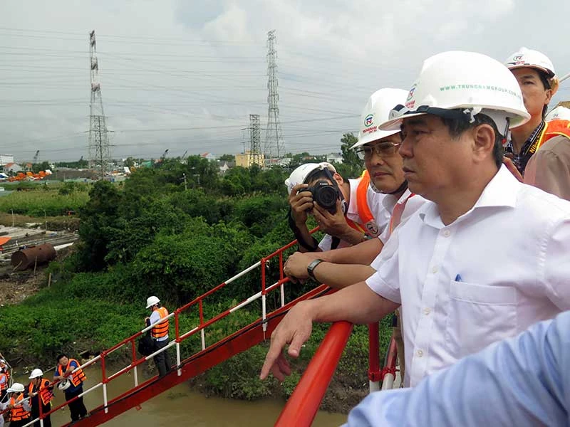 Chủ tịch UBND TP.HCM Nguyễn Thành Phong kiểm tra dự án cống Mương Chuối, huyện Nhà Bè. Ảnh: HOÀNG HẢI