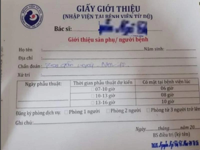 Một giấy giới thiệu nhập viện tại BV Từ Dũ sinh mổ. Ảnh: TN