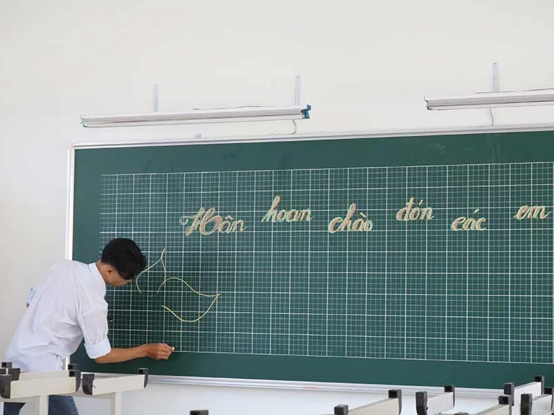 Thầy giáo Trường Tiểu học Phạm Văn Chính tỉ mỉ trang trí tấm bảng để chào đón học sinh trong ngày đầu năm học mới. Ảnh: THỦY TRÚC