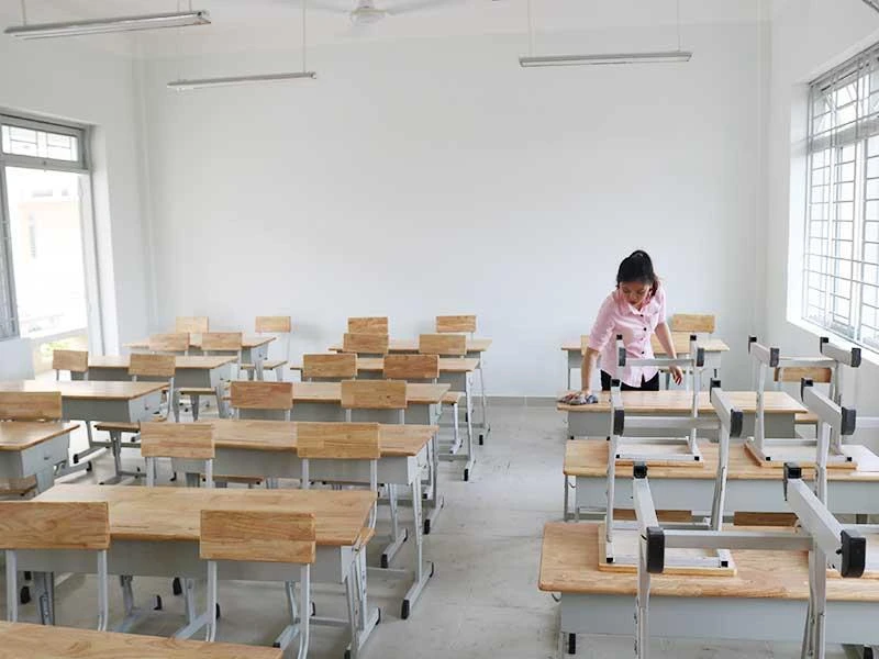 Cô giáo Trường Phạm Văn Chính dọn dẹp, vệ sinh lớp học để đón đàn con thân yêu trong ngôi trường mới. Ảnh: THỦY TRÚC