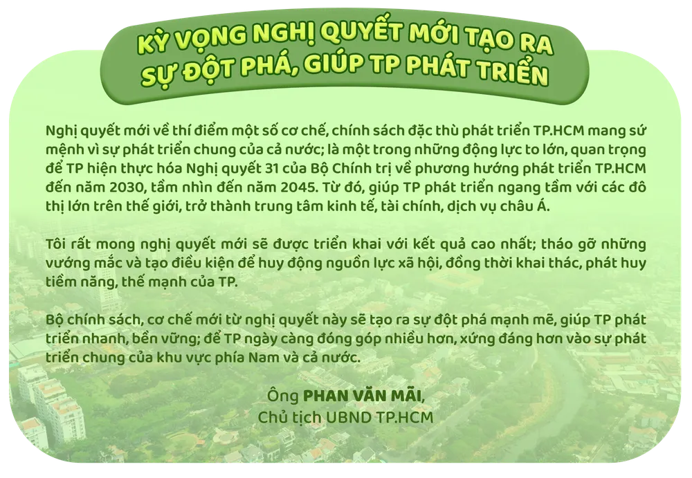 + Ông Phan Văn Mãi: Tôi cảm thấy rất vui và phấn khởi khi nghị quyết mới đã được QH đồng thuận và bấm nút thông qua tại kỳ họp lần này. Đây được xem là chiếc chìa khóa về mặt thể chế, mở ra không gian phát triển mới cho TP.HCM, để TP phát huy mạnh mẽ hơn nữa tiềm năng, lợi thế vốn có của mình; đồng thời nhanh chóng tháo gỡ các vướng mắc gặp phải trong quá trình phát triển kinh tế - xã hội. Điều đó sẽ giúp TP phát huy tối đa nguồn lực, tiếp tục thực hiện sứ mệnh “cùng cả nước, vì cả nước” mà Nghị quyết 31 của Bộ Chính trị đặt ra cho TP.HCM.