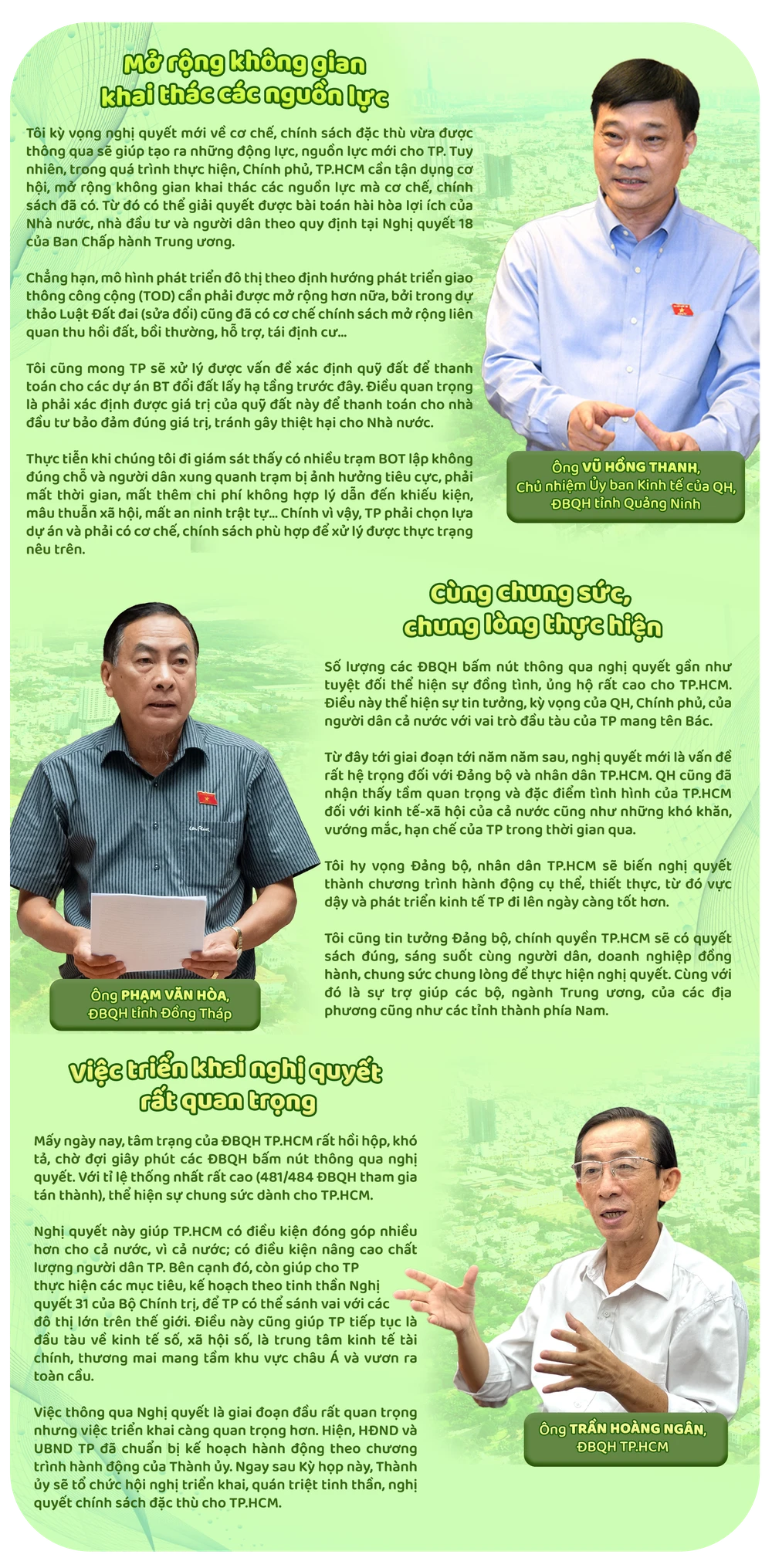 + Tôi nhận thấy cán bộ, công chức, viên chức, người dân và cộng đồng doanh nghiệp TP đang rất phấn khởi khi đón nhận nghị quyết mới và sẵn sàng tổ chức triển khai, thực hiện nghị quyết đặc biệt quan trọng này.