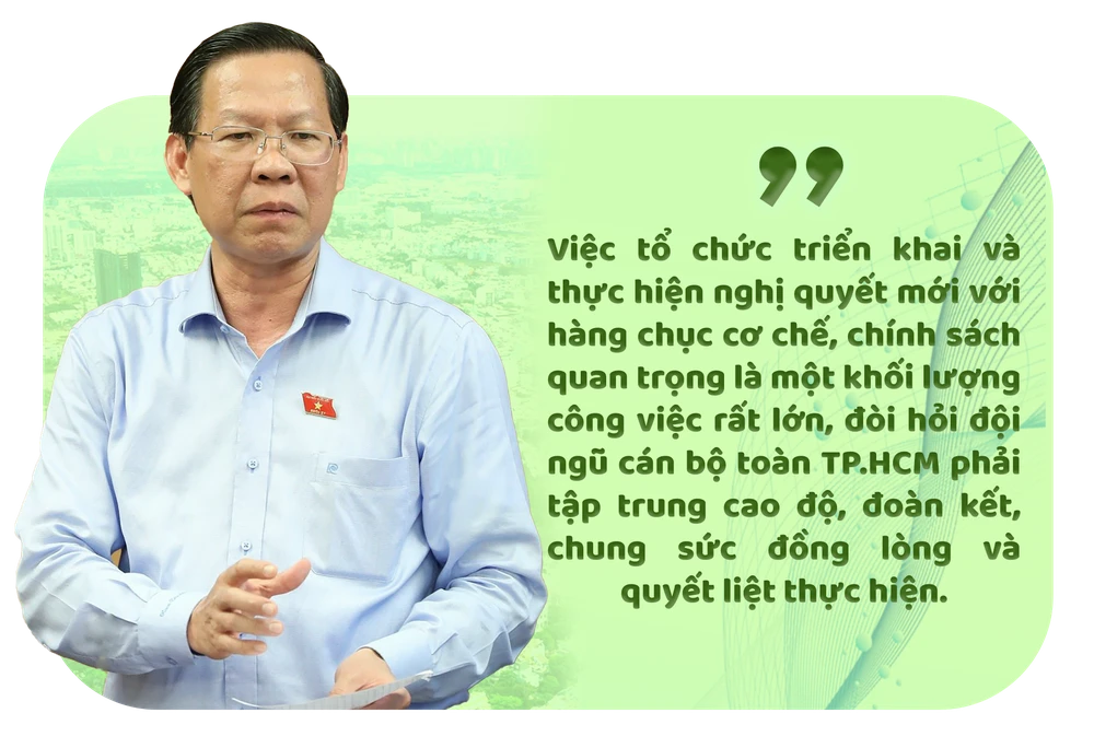 Hiện nay, việc tổ chức triển khai và thực hiện nghị quyết mới với hàng chục cơ chế, chính sách quan trọng là một khối lượng công việc rất lớn, đòi hỏi đội ngũ cán bộ toàn TP phải tập trung cao độ, đoàn kết, chung sức đồng lòng, quyết liệt trong quá trình triển khai thực hiện. Tất nhiên, UBND TP.HCM sẽ phân công cụ thể, theo dõi, đôn đốc thường xuyên; khen thưởng, kỷ luật kịp thời. Đồng thời rà soát điều chỉnh, bổ sung các quy định, quy chế phối hợp, cũng như kịp thời giải quyết các vướng mắc trong quá trình tổ chức thực hiện.