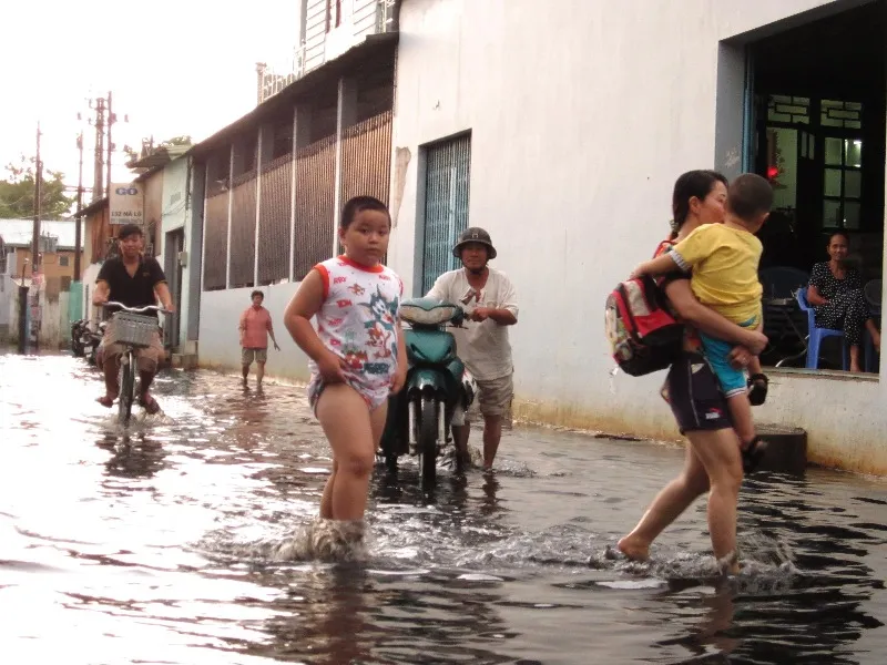 Người lớn và trẻ con bì bõm lội nước cống đen ngòm.