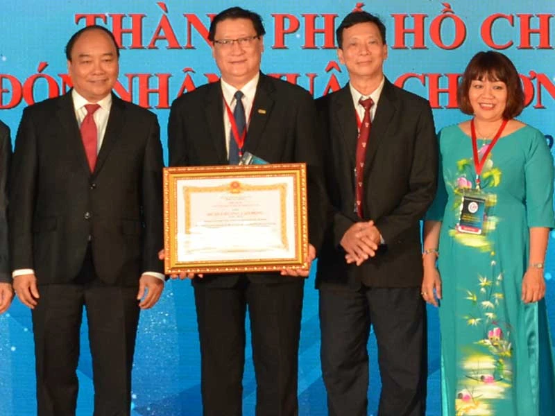 Thủ tướng Nguyễn Xuân Phúc (bìa trái) trao bằng khen cho các tập thể Khu công nghệ cao TP.HCM. Ảnh: T.LÂM