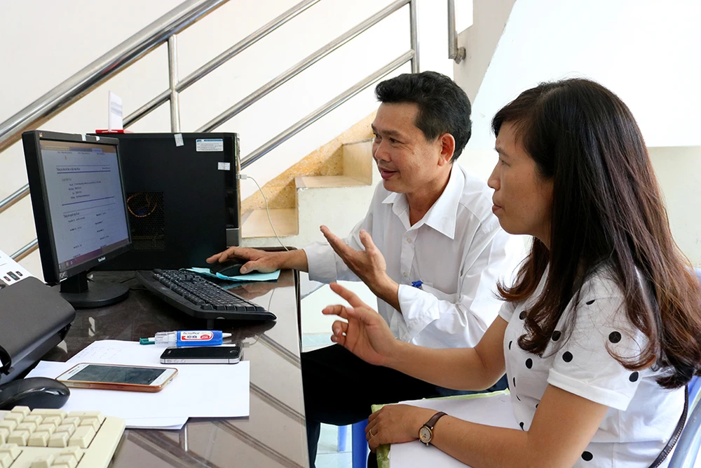 Cán bộ quận Bình Tân hướng dẫn người dân thực hiện dịch vụ công trực tuyến Ảnh: LÊ THOA