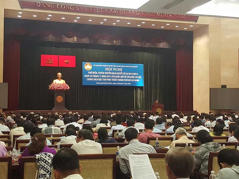 Tại hội nghị, các đại biểu đã nghe Chủ tịch HĐND TP.HCM Nguyễn Thị Quyết Tâm báo cáo các nội dung chính của Nghị quyết 54. Theo đó, nghị quyết này quy định thí điểm cơ chế, chính sách đặc thù đối với TP.HCM về quản lý đất đai, đầu tư, tài chính, ngân sách nhà nước; quy định cơ chế ủy quyền giữa các cấp chính quyền và thu nhập của cán bộ, công chức, viên chức thuộc TP quản lý.