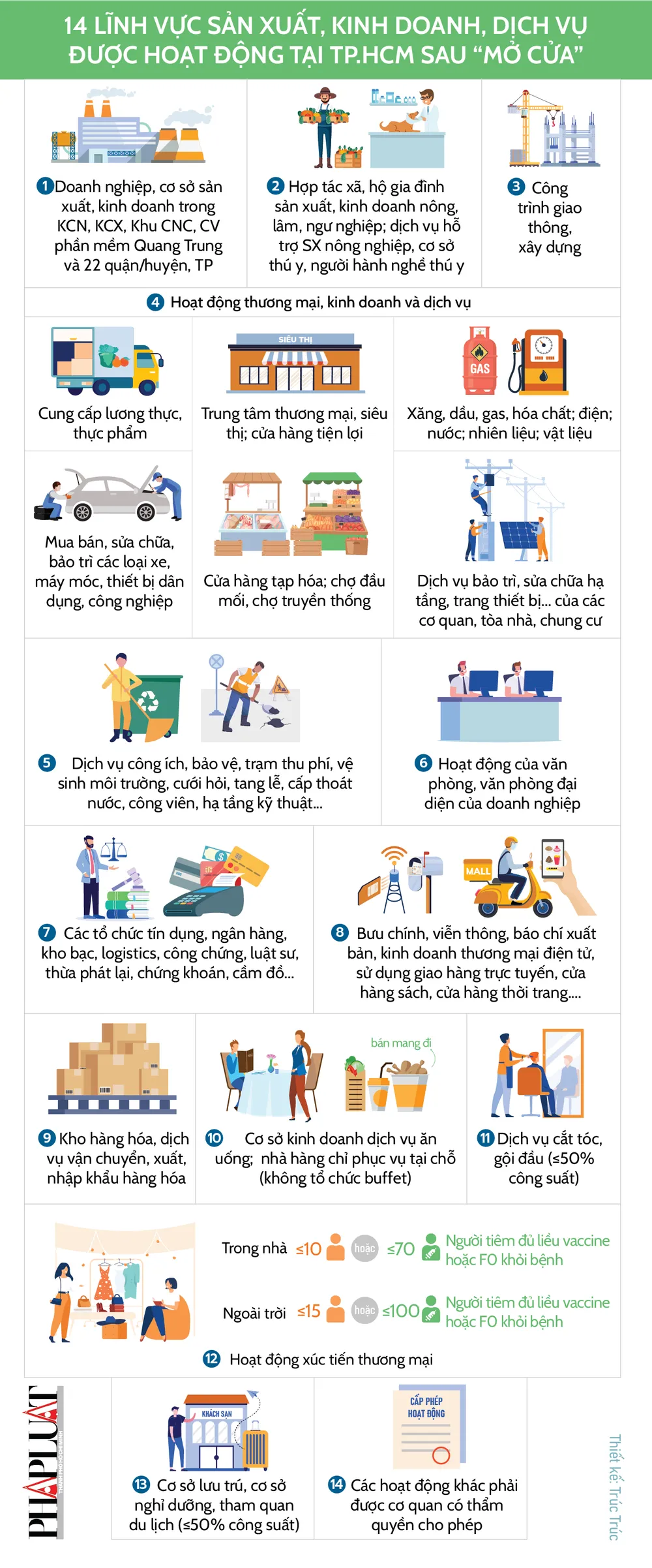 Theo đó, UBND TP.HCM cho phép mở lại nhiều hoạt động trên các lĩnh vực khác nhau, trong đó có 14 ngành nghề sản xuất, kinh doanh, dịch vụ, thương mại và các cơ sở khám bệnh, chữa bệnh công lập và tư nhân; các cơ sở dịch vụ y tế; các cơ sở kinh doanh dược, mỹ phẩm, vật tư, trang thiết bị y tế...