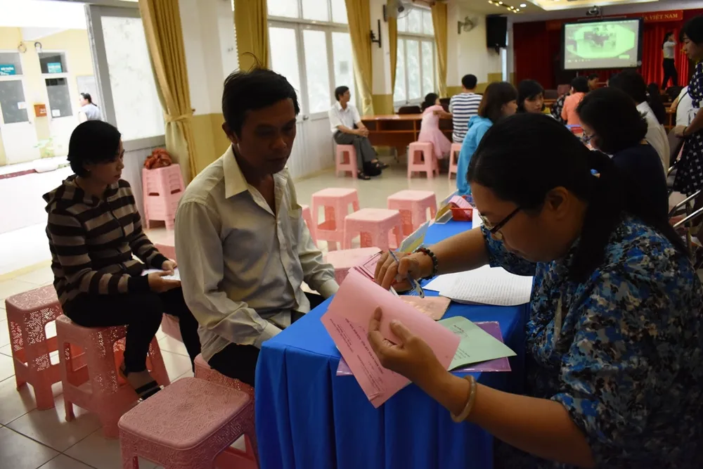 Phụ huynh trường tiểu học Nguyễn Bỉnh Khiêm, quận 1 đến trường nộp hồ sơ cho con vào lớp 1. Ảnh: NQ