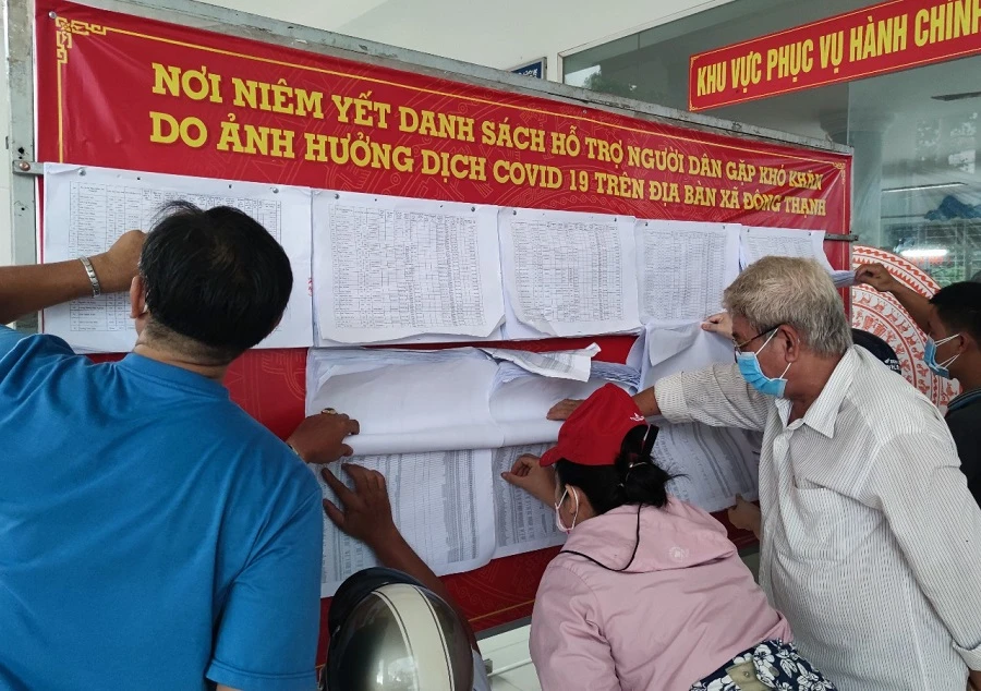 Người dân đến trụ sở UBND xã Đông Thạnh, huyện Hóc Môn xem danh sách hỗ trợ đợt 3. Ảnh: NGUYỄN HIỀN