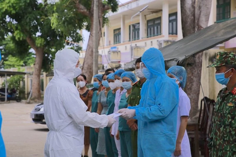 Chủ tịch UBND tỉnh Quảng Nam ông Lê Trí Thanh tới thăm và tặng quà cho bà con, cán bộ làm nhiệm vụ trong khu cách ly người dân đưa từ TP.HCM về. Ảnh: THANH NHẬT